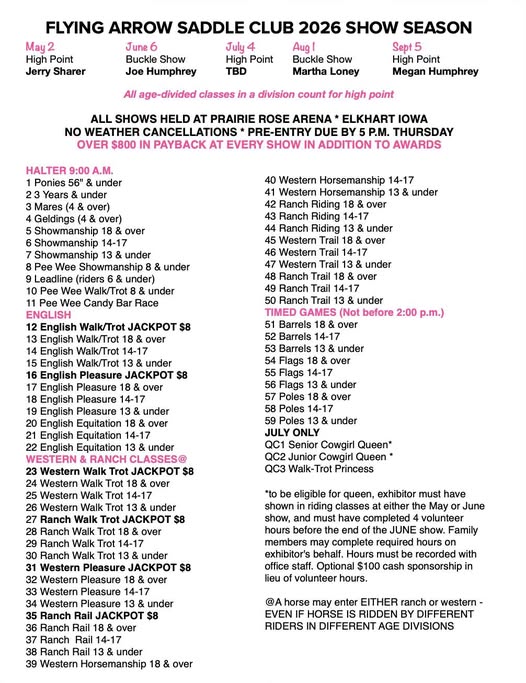 Flying Arrow Saddle Club will be using SaddleBook software this year– exhibitors will need to make an account with Saddlebook (it’s free) and then the entry link will be posted for the first show April 1. No more local network crashes during the shows!